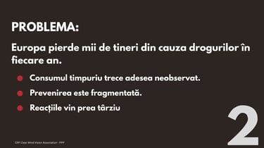 CRP Clear Mind Vision este o asociație axată pe prevenire, dedicată sprijinirii familiilor, școlilor, locurilor de muncă și comunităților în crearea unor medii mai sigure și mai sănătoase. Prin educație, instrumente de depistare timpurie și programe de sensibilizare responsabile, îi ajutăm pe oameni să ia decizii în cunoștință de cauză și să protejeze ceea ce contează cel mai mult.